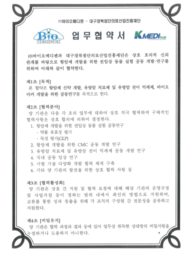 • 2023년 09월 12일 ㈜바이오메디젠 & 대구경북첨단의료산업진흥재단(K-MEDI Hub) MOU 체결.
