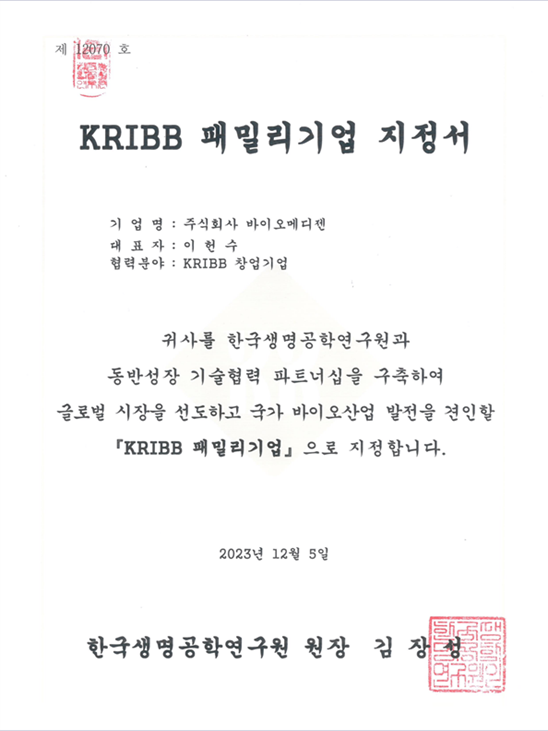• 2023년 12월 05일 한국생명공학연구원(KRIBB) 패밀리기업 지정 및 네트워킹데이 참석.